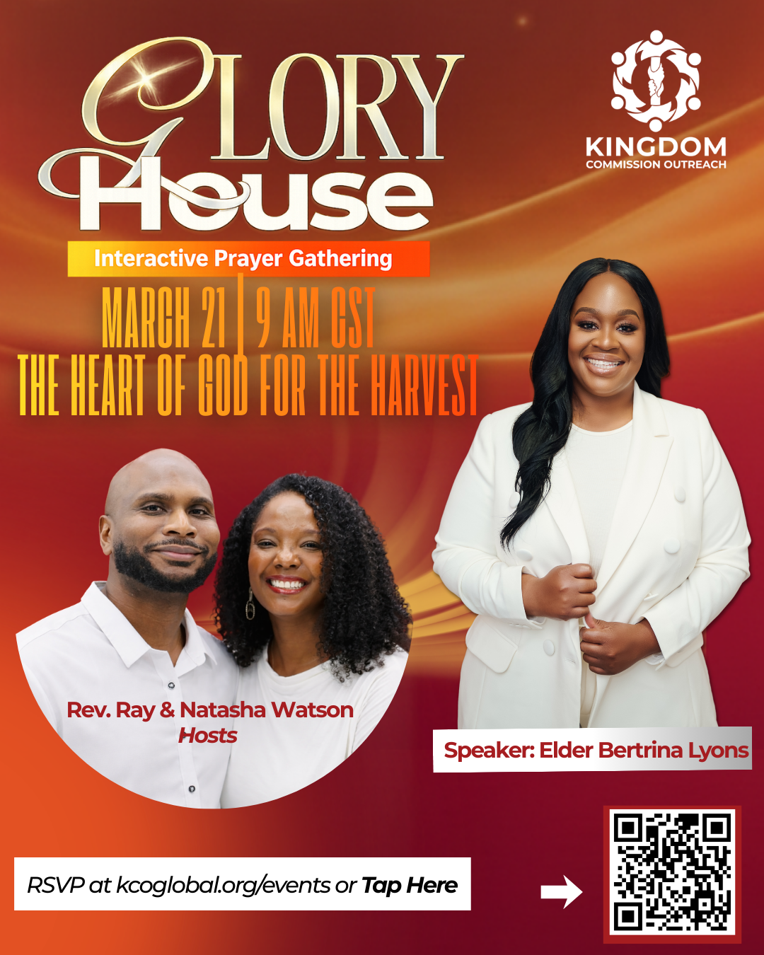 As we continue the 2026 Tenacity for Witness series, join Kingdom Commission Outreach for Glory House on March 21. Elder Bertrina Lyons, a prophet and leader in the Kingdom of God will minister on the topic “The Heart of God for the Harvest.” Glory House is a time of worship, prayer, and the Word as we decree the will of God and usher in His glory within the Church, our families, and the world.